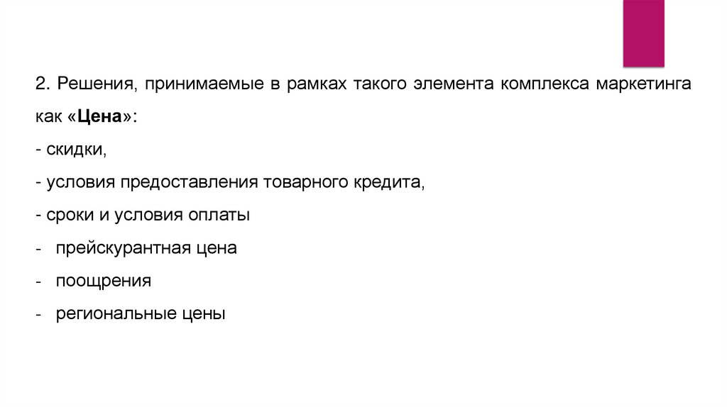 2. Решения, принимаемые в рамках такого элемента комплекса маркетингакак «Цена»: