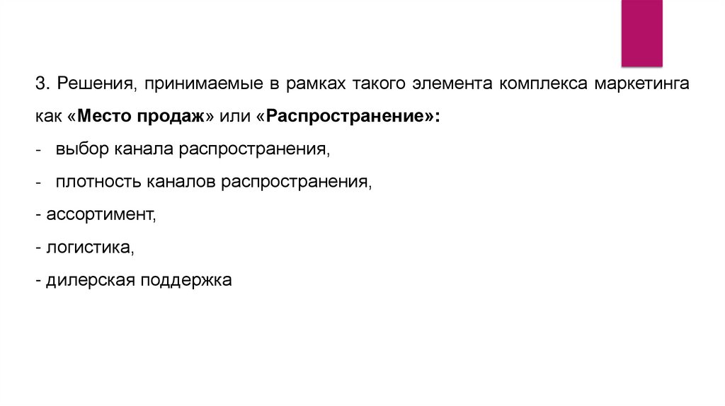 3. Решения, принимаемые в рамках такого элемента комплекса маркетингакак «Место продаж» или «Распространение»: