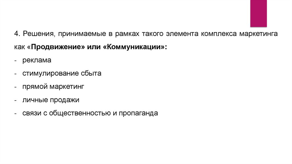 4. Решения, принимаемые в рамках такого элемента комплекса маркетингакак «Продвижение» или «Коммуникации»: