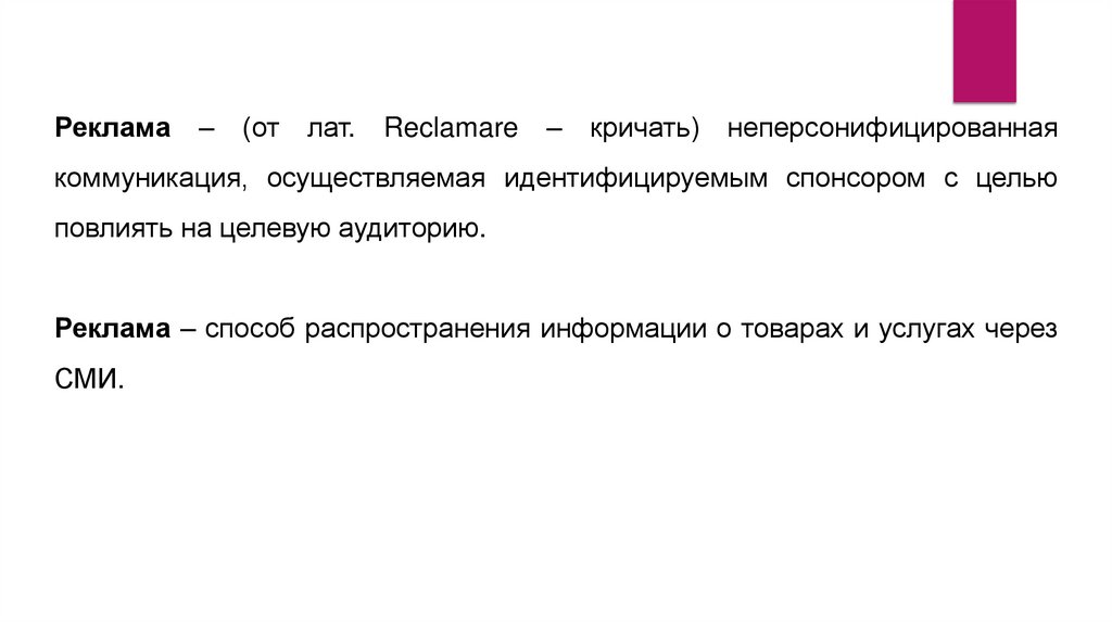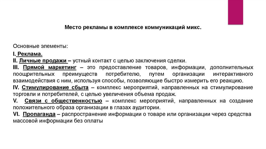 Место рекламы в комплексе коммуникаций микс.Основные элементы: