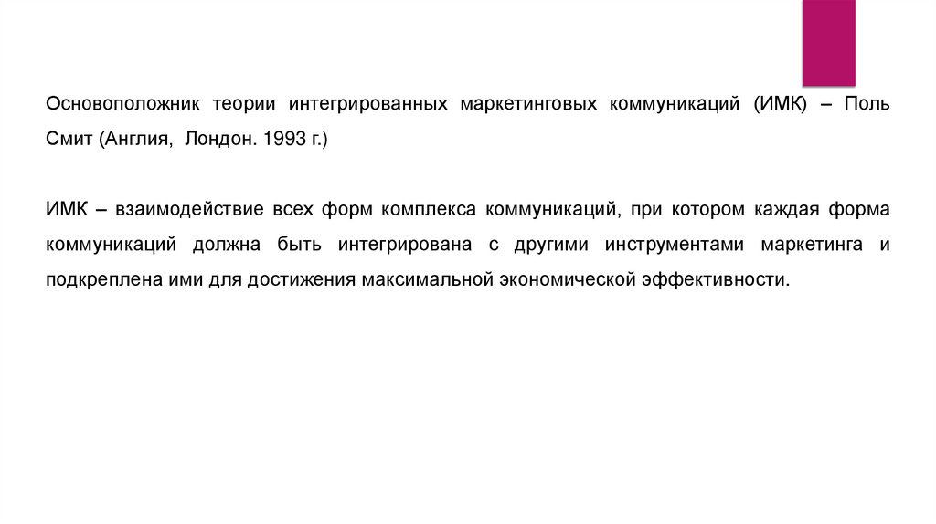 Основоположник теории интегрированных маркетинговых коммуникаций (ИМК) – ПольСмит (Англия, Лондон. 1993 г.)