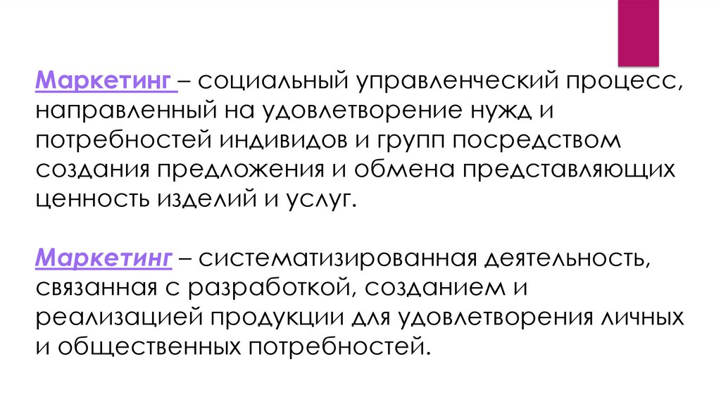 Маркетинг – социальный управленческий процесс,направленный на удовлетворение нужд и