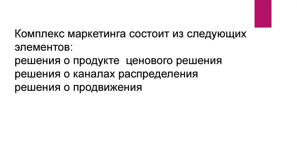 Комплекс маркетинга связан со следующими решениями, принимаемыми врамках отдельных его элементов: