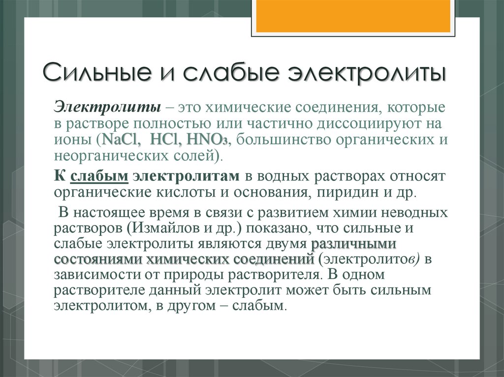 Сильные и слабые электролитыЭлектролиты – это химические соединения, которые