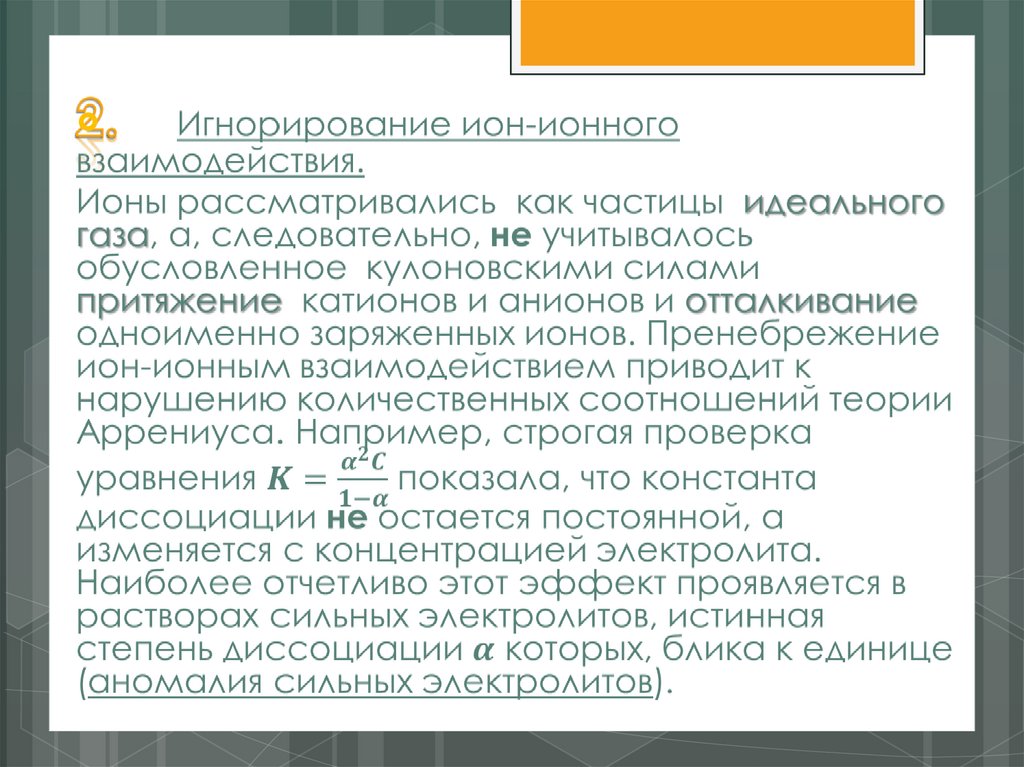 Данная теория игнорирует взаимодействиеионов с диполями воды или другого растворителя,