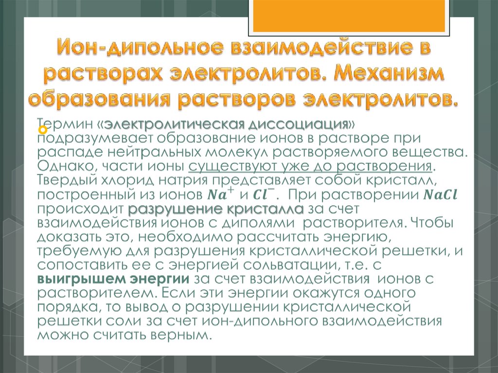 22. Ион-дипольное взаимодействие в растворах электролитов. Механизм образования растворов электролитов.
