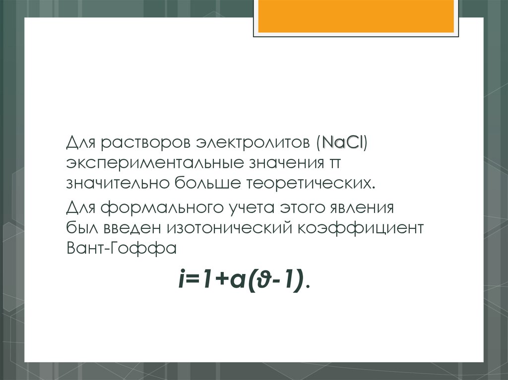 Для растворов электролитов (NaCl)экспериментальные значения π