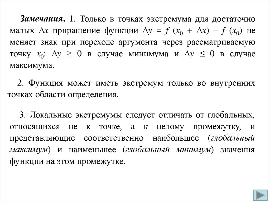 Замечания. 1. Только в точках экстремума для достаточномалых ∆x приращение функции ∆y = f (x0 + ∆x) – f (x0) не
