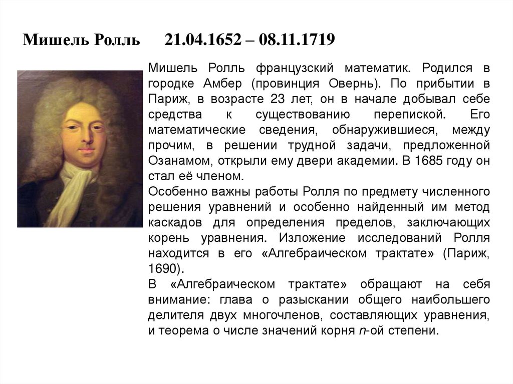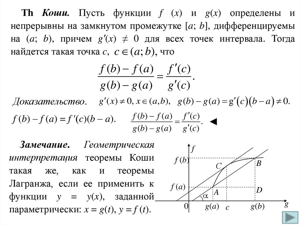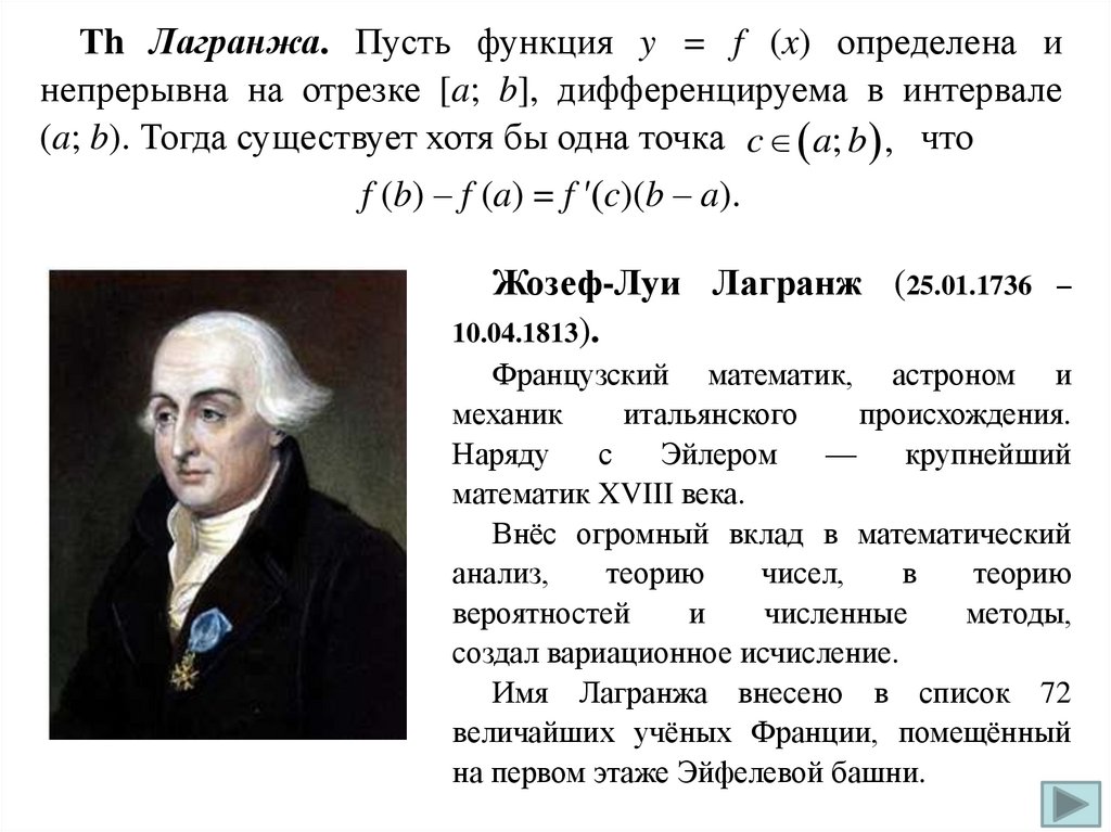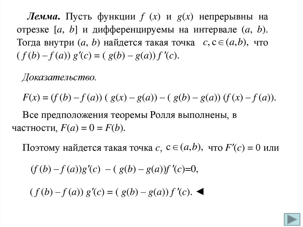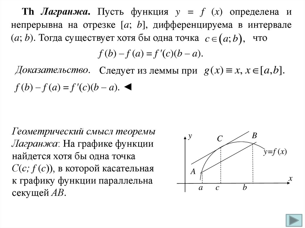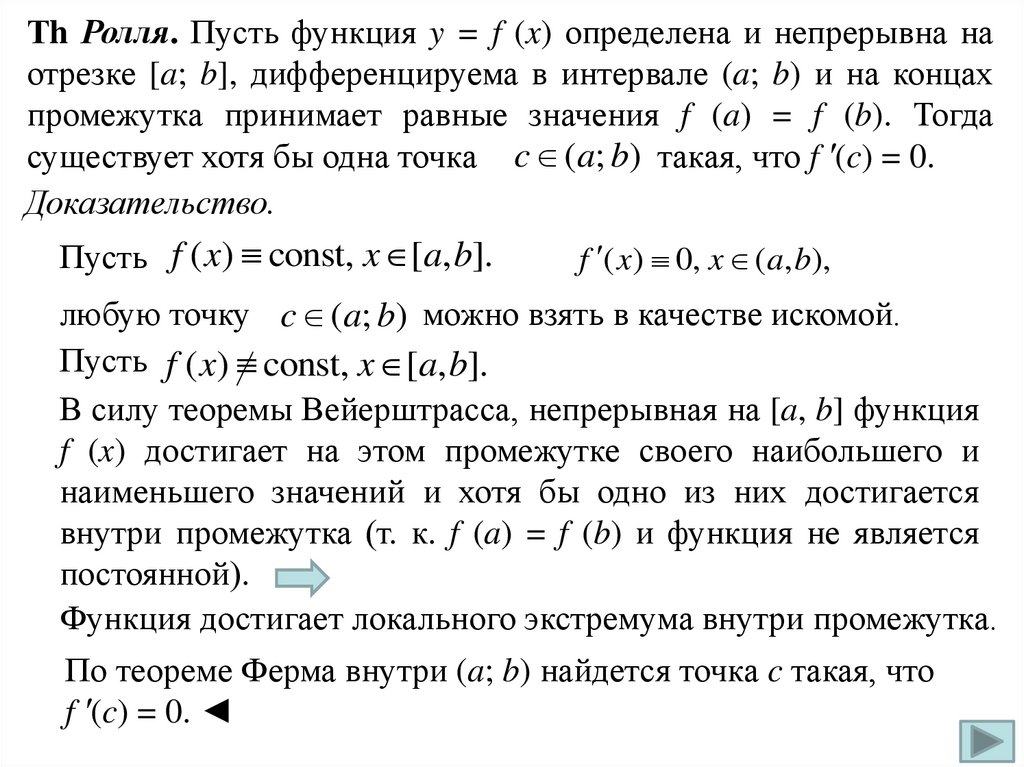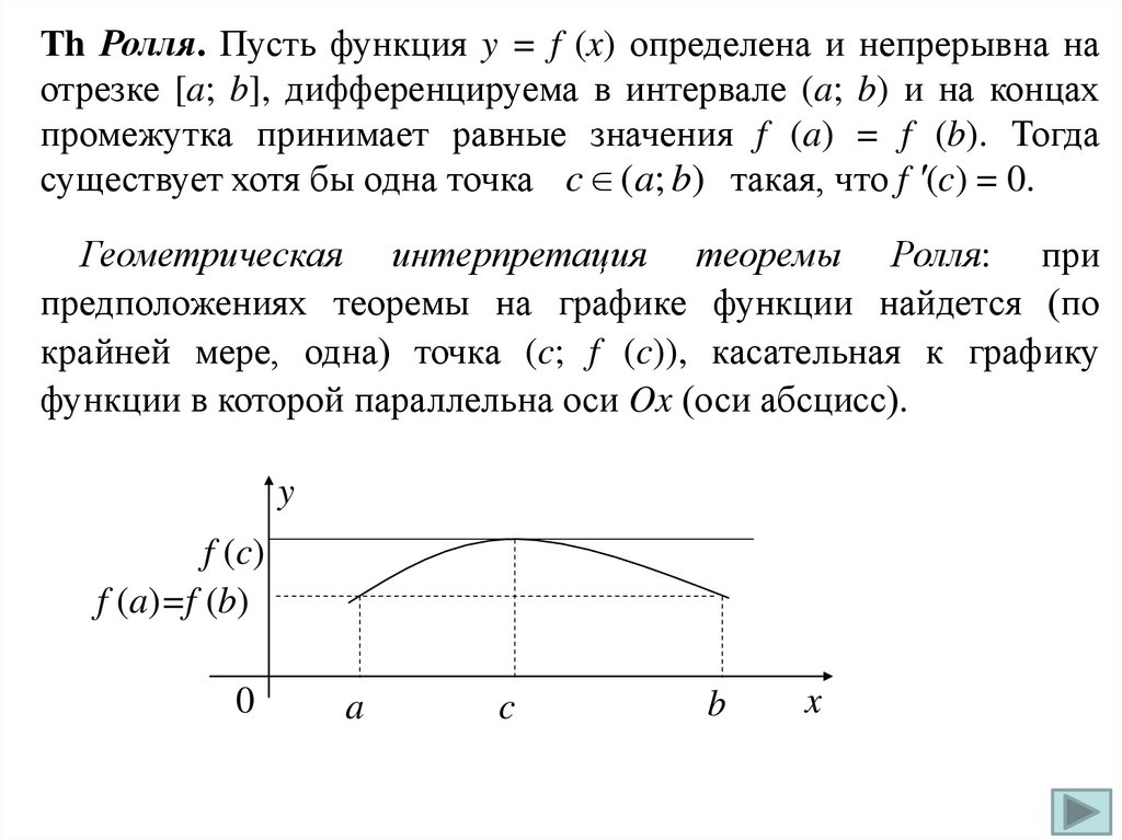 Тh Ролля. Пусть функция y = f (x) определена и непрерывна наотрезке [a; b], дифференцируема в интервале (a; b) и на концах