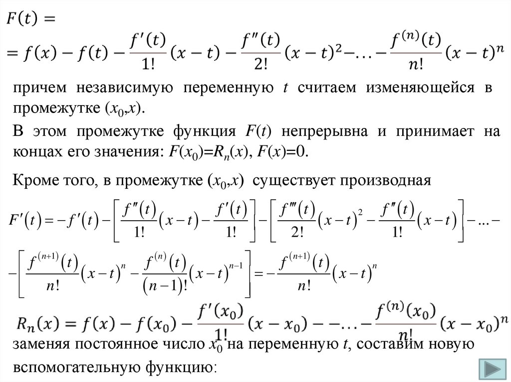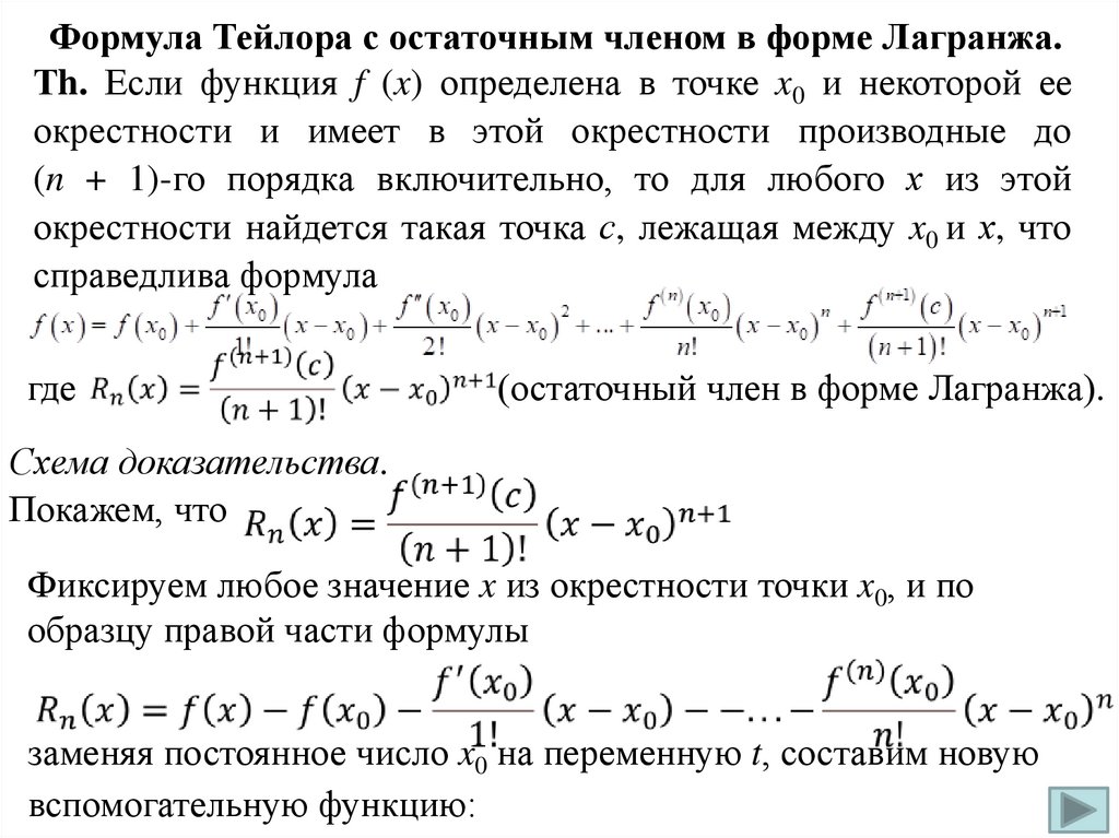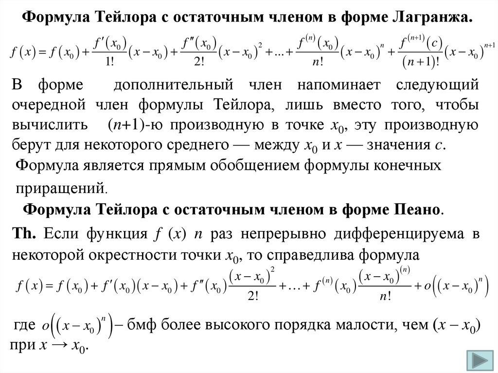Некоторые записи формулы Тейлора.Формула Тейлора с остаточным членом в форме Лагранжа: