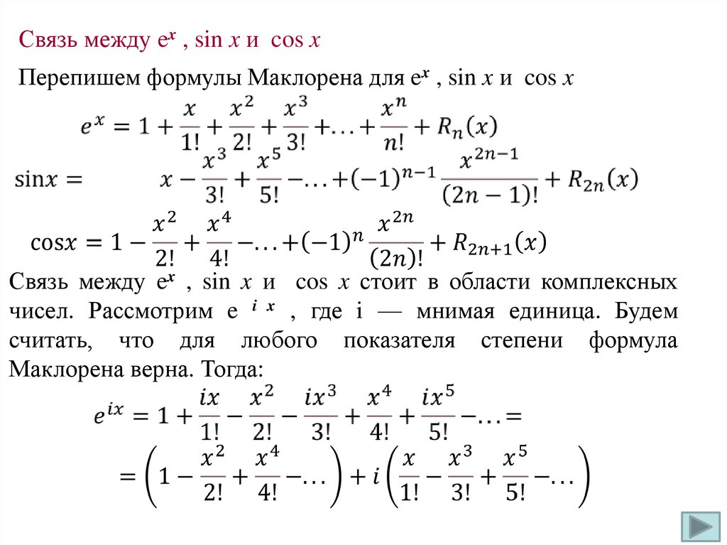 Связь между ex , sin x и cos xПерепишем формулы Маклорена для ex , sin x и cos x