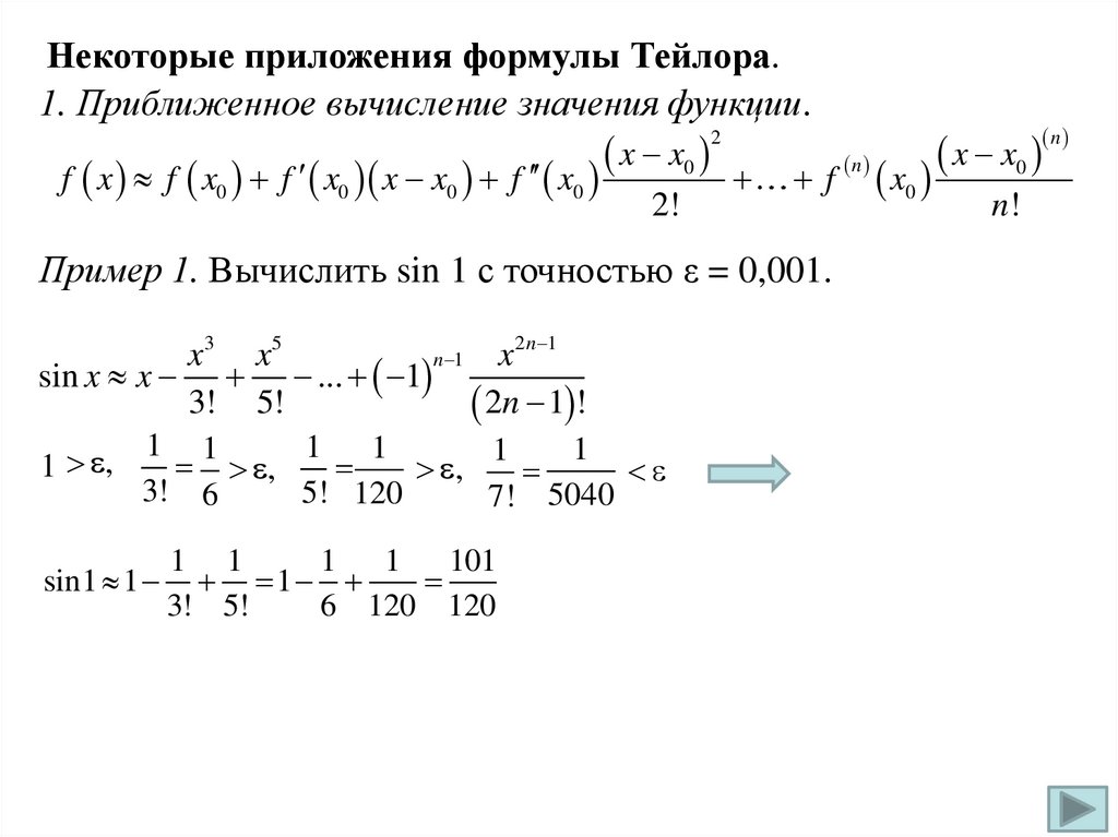 Некоторые приложения формулы Тейлора.1. Приближенное вычисление значения функции.
