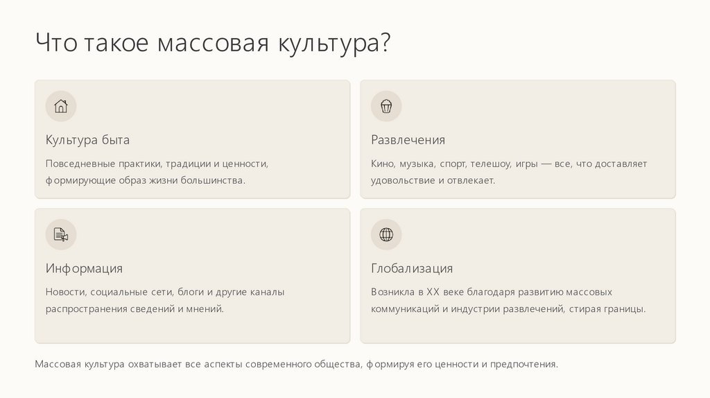 Массовая культура охватывает все аспекты современного общества, ф ормируя его ценности и предпочтения.