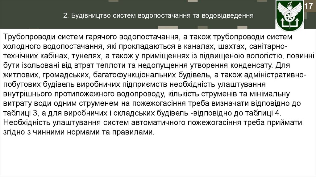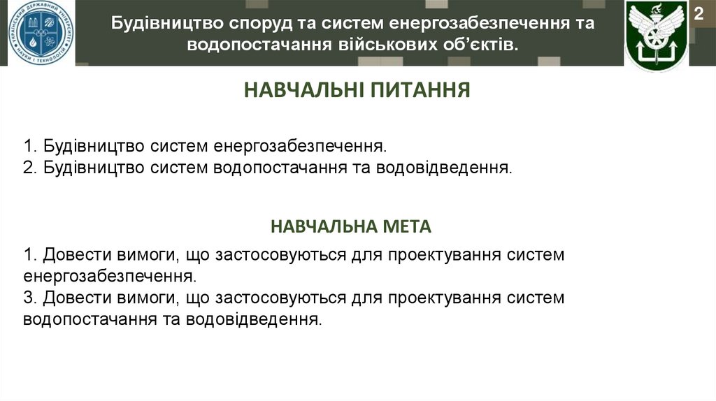 Будівництво споруд та систем енергозабезпечення таводопостачання військових об’єктів.