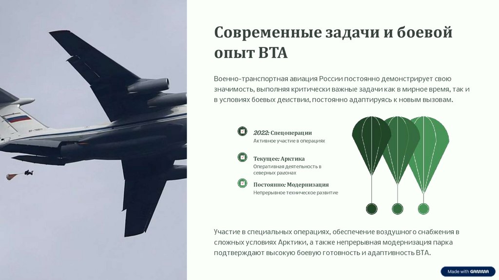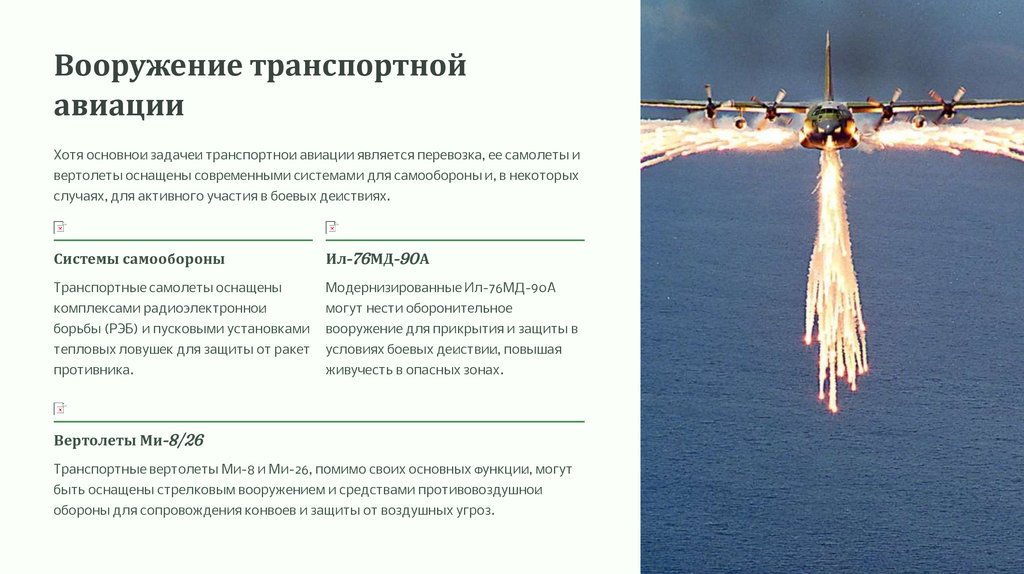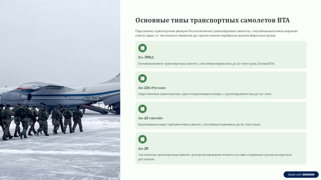 Основные типы транспортных самолетов ВТАПарк военно-транспортной авиации России включает разнообразные самолеты, способные выполнять широкий