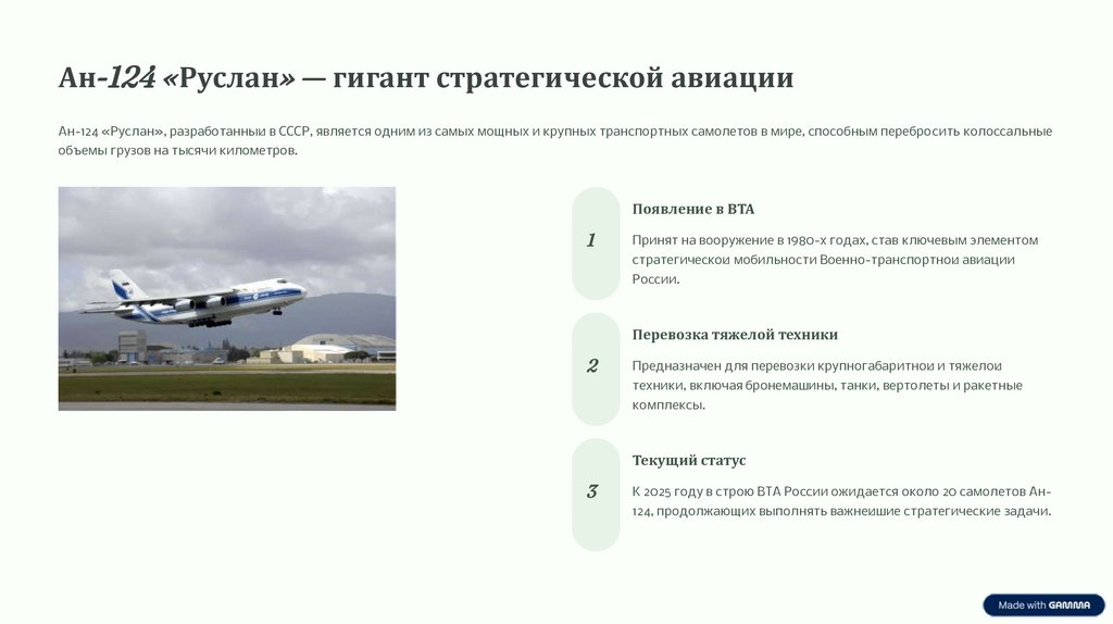 Ан-124 «Руслан» — гигант стратегической авиацииАн-124 «Руслан», разработанный в СССР, является одним из самых мощных и крупных транспортных самолетов в мире, способным перебросить колоссальные