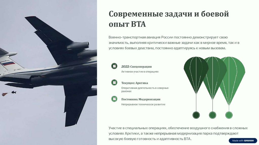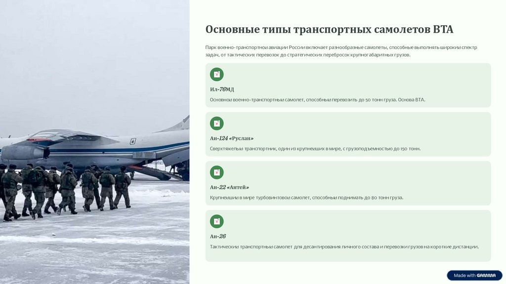 Основные типы транспортных самолетов ВТАПарк военно-транспортной авиации России включает разнообразные самолеты, способные выполнять широкий спектр