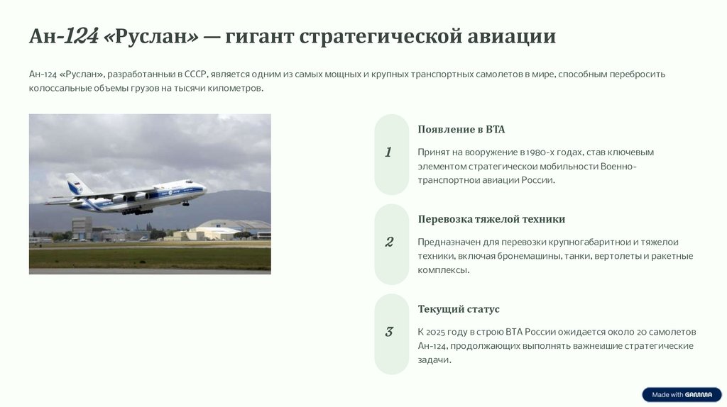 Ан-124 «Руслан» — гигант стратегической авиацииАн-124 «Руслан», разработанный в СССР, является одним из самых мощных и крупных транспортных самолетов в мире, способным перебросить