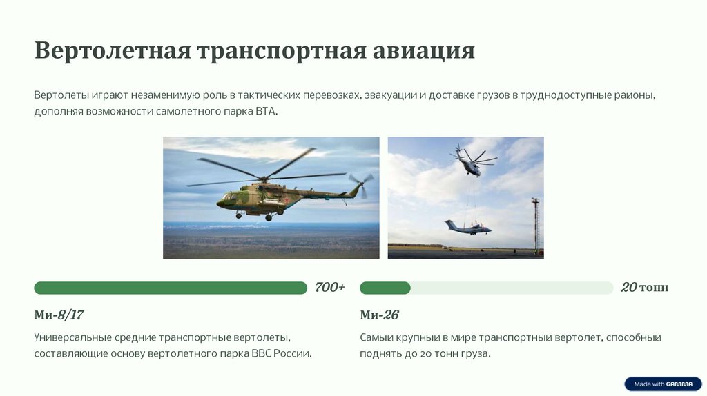 Вертолетная транспортная авиацияВертолеты играют незаменимую роль в тактических перевозках, эвакуации и доставке грузов в труднодоступные районы,