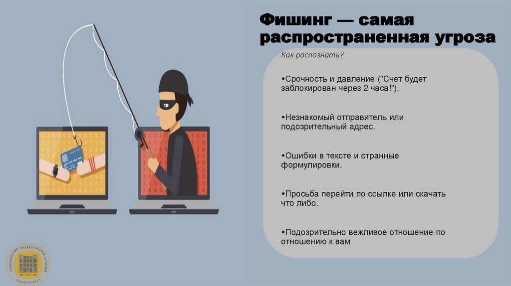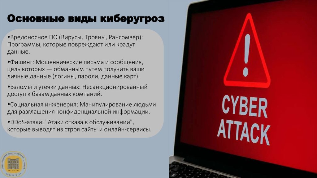 Основные виды киберугрозВредоносное ПО (Вирусы, Трояны, Рансомвер):