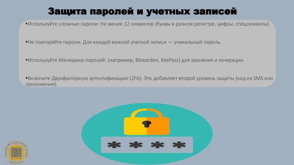 Защита паролей и учетных записейИспользуйте сложные пароли: Не менее 12 символов (буквы в разном регистре, цифры, спецсимволы).