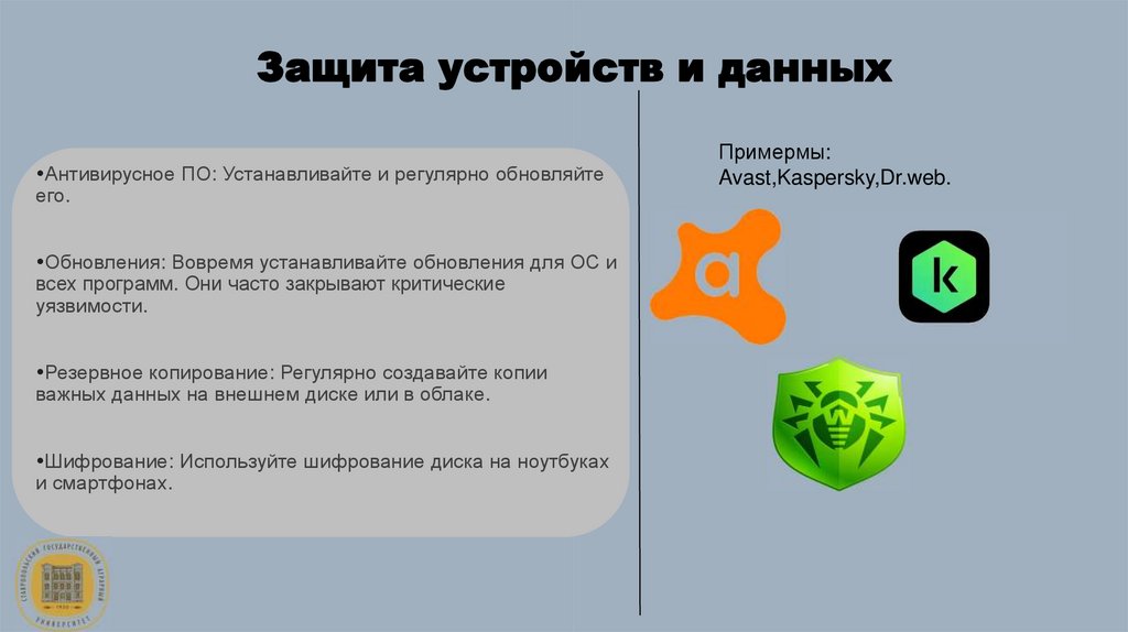 Защита устройств и данныхАнтивирусное ПО: Устанавливайте и регулярно обновляйте