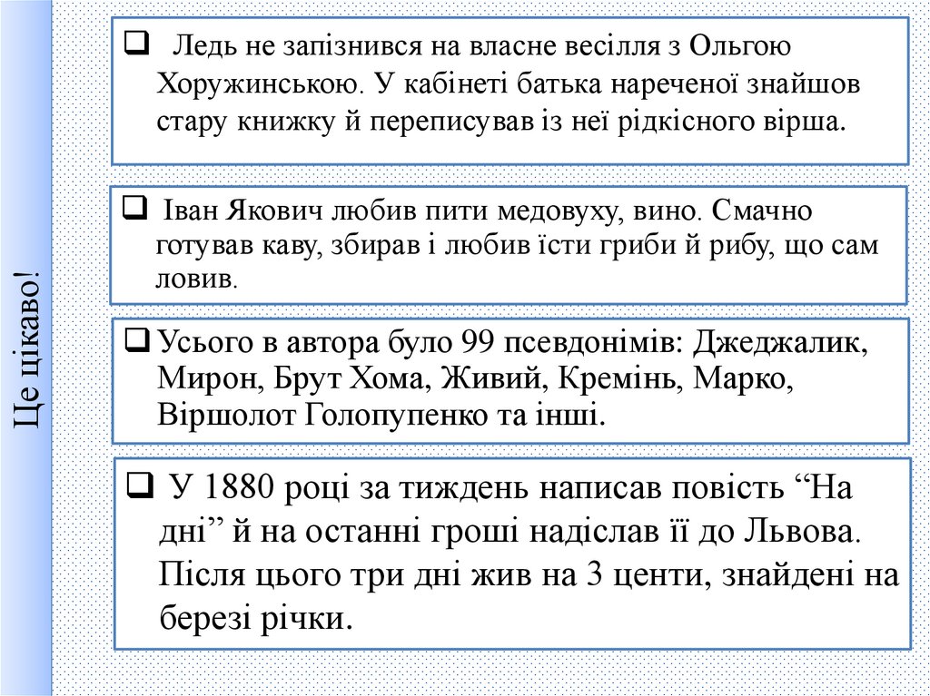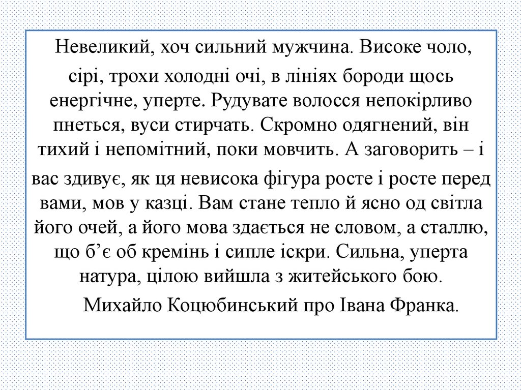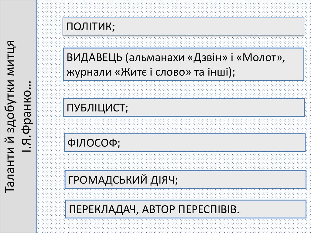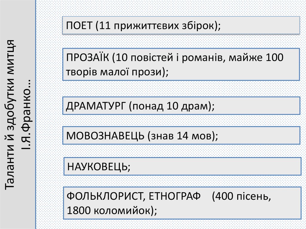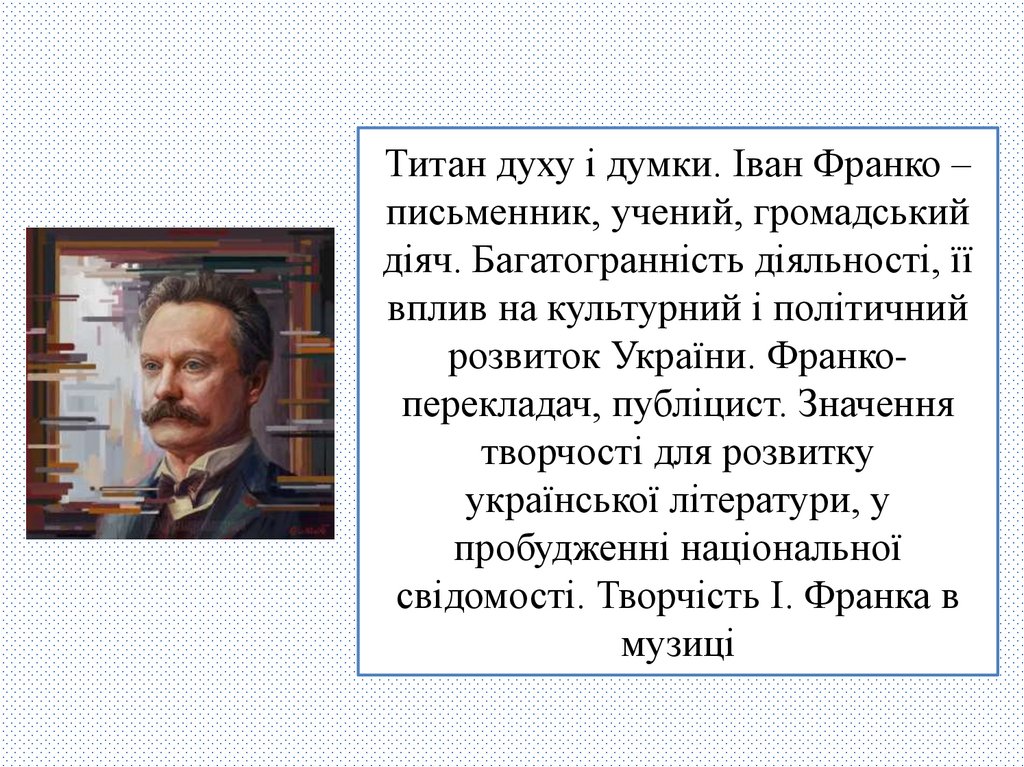 1. Титан духу і думки. Іван Франко – письменник, учений, громадський діяч. Багатогранність діяльності, її вплив на культурний і