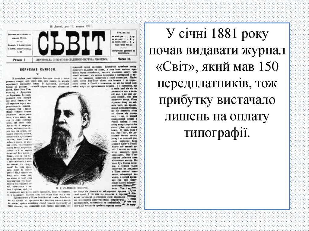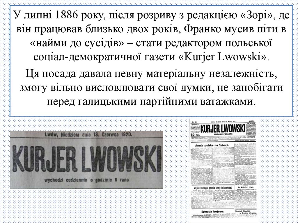У липні 1886 pоку, після розриву з редакцією «Зорі», девін працював близько двох років, Франко мусив піти в