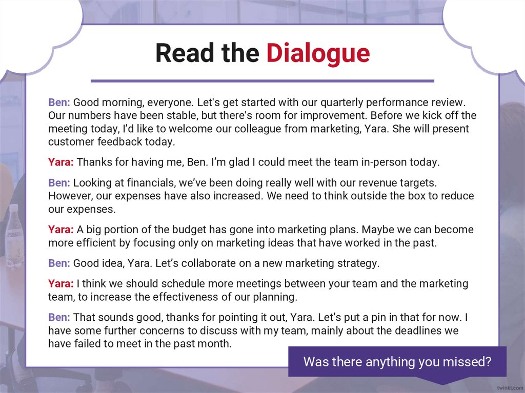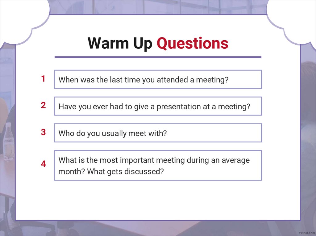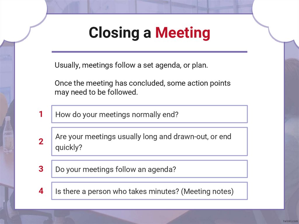 Closing a MeetingUsually, meetings follow a set agenda, or plan.