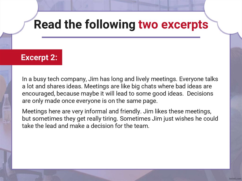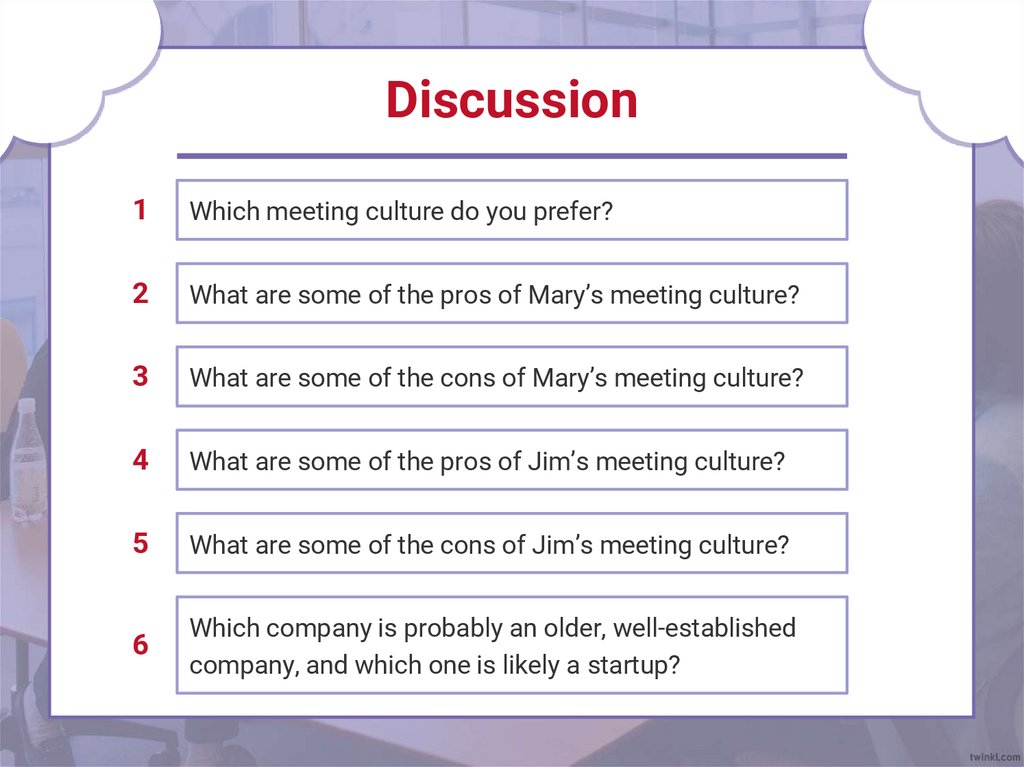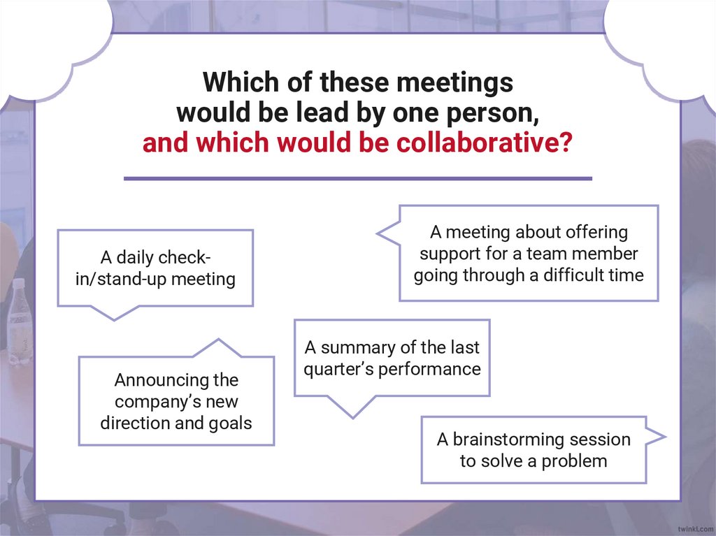 In a busy tech company, Jim has long and lively meetings. Everyone talks