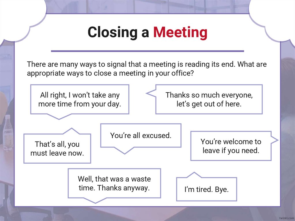 Closing a MeetingThere are many ways to signal that a meeting is reading its end. What are
