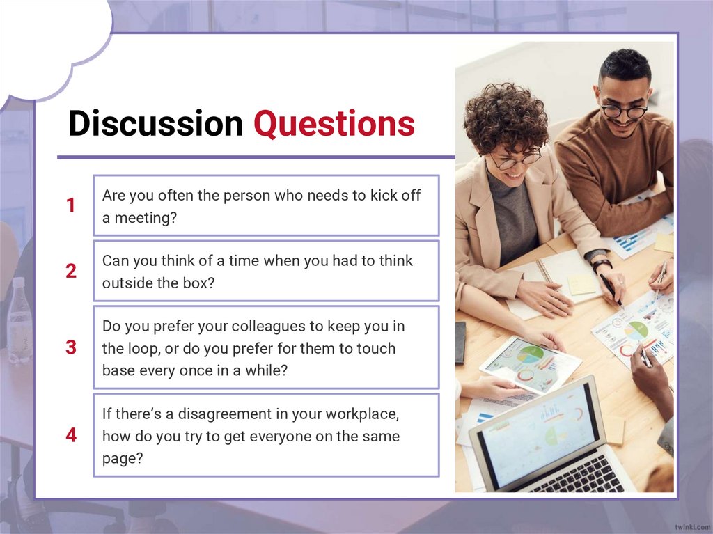 a lot and shares ideas. Meetings are like big chats where bad ideas are