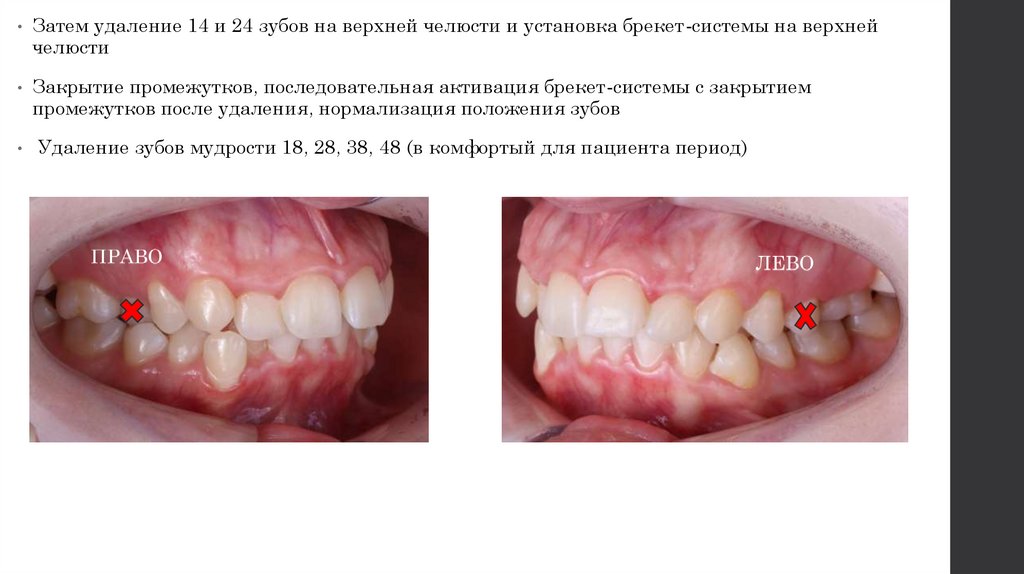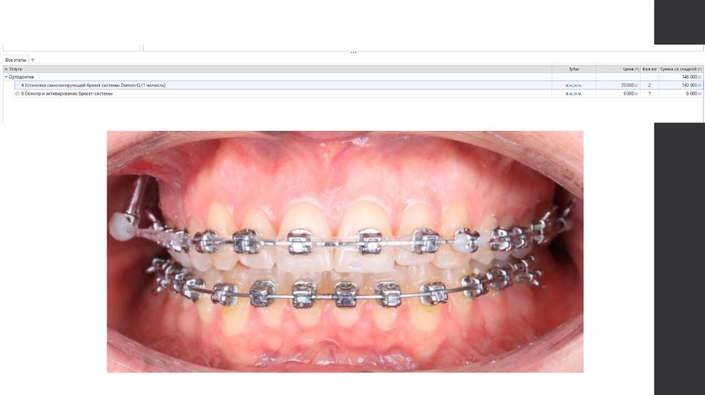 • Затем удаление 14 и 24 зубов на верхней челюсти и установка брекет-системы на верхнейчелюсти