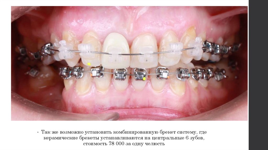 • Так же возможно установить комбинированную брекет систему, гдекерамические брекеты устанавливаются на центральные 6 зубов,