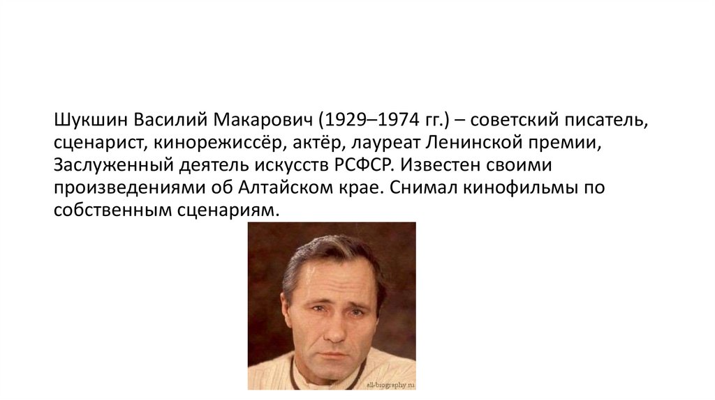 Шукшин Василий Макарович (1929–1974 гг.) – советский писатель,сценарист, кинорежиссёр, актёр, лауреат Ленинской премии,