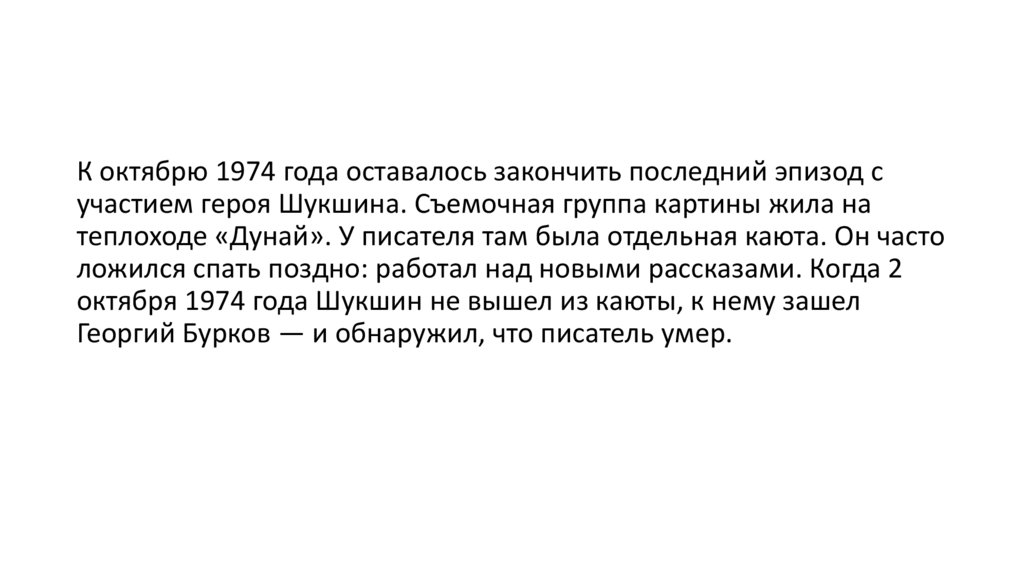 октября 1974 года Шукшин не вышел из каюты, к нему зашел