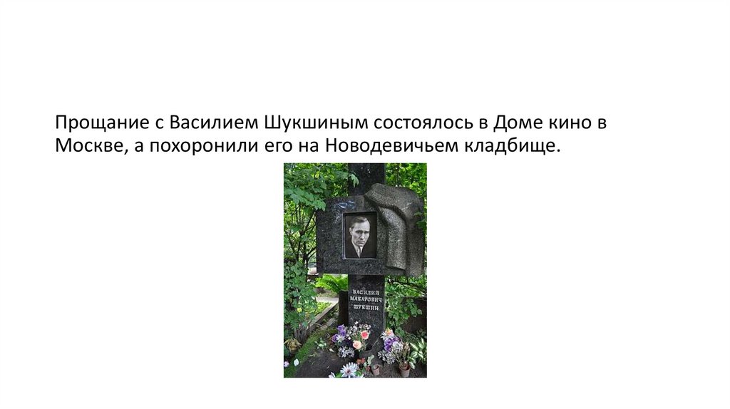 Прощание с Василием Шукшиным состоялось в Доме кино вМоскве, а похоронили его на Новодевичьем кладбище.