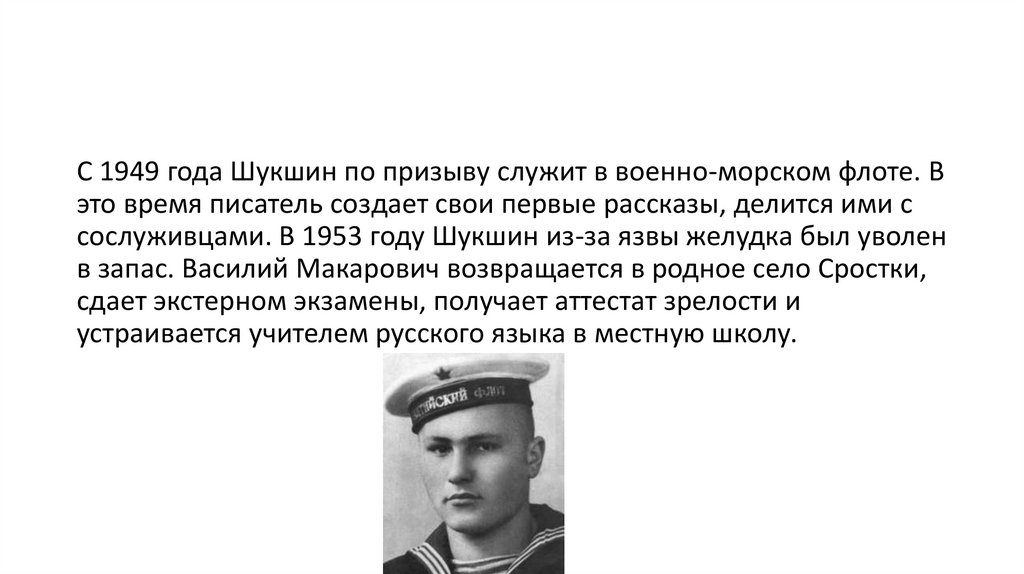 С 1949 года Шукшин по призыву служит в военно-морском флоте. Вэто время писатель создает свои первые рассказы, делится ими с