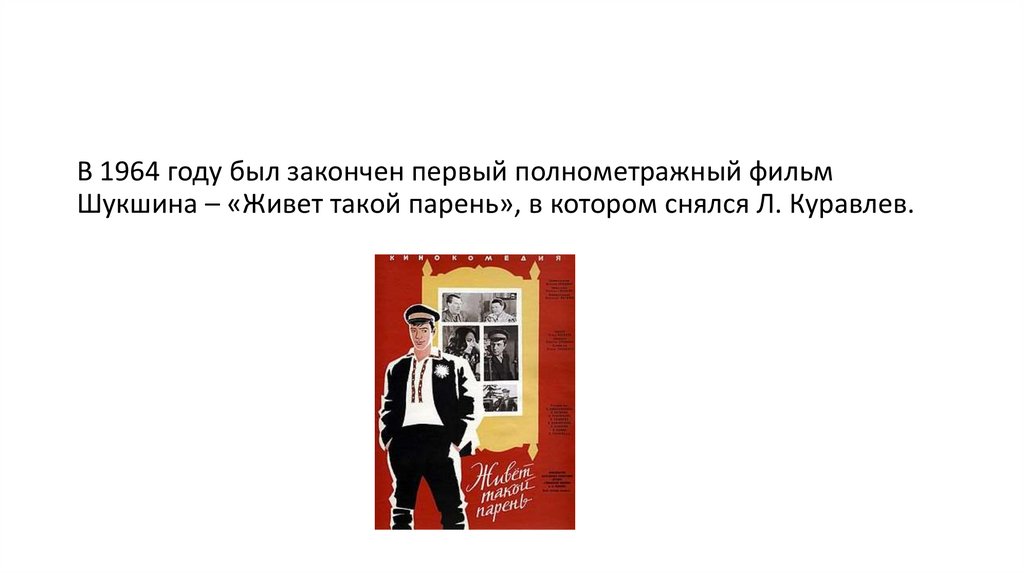 В 1964 году был закончен первый полнометражный фильмШукшина – «Живет такой парень», в котором снялся Л. Куравлев.