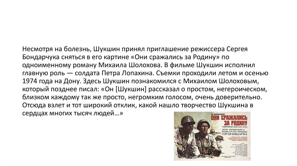 Несмотря на болезнь, Шукшин принял приглашение режиссера СергеяБондарчука сняться в его картине «Они сражались за Родину» по