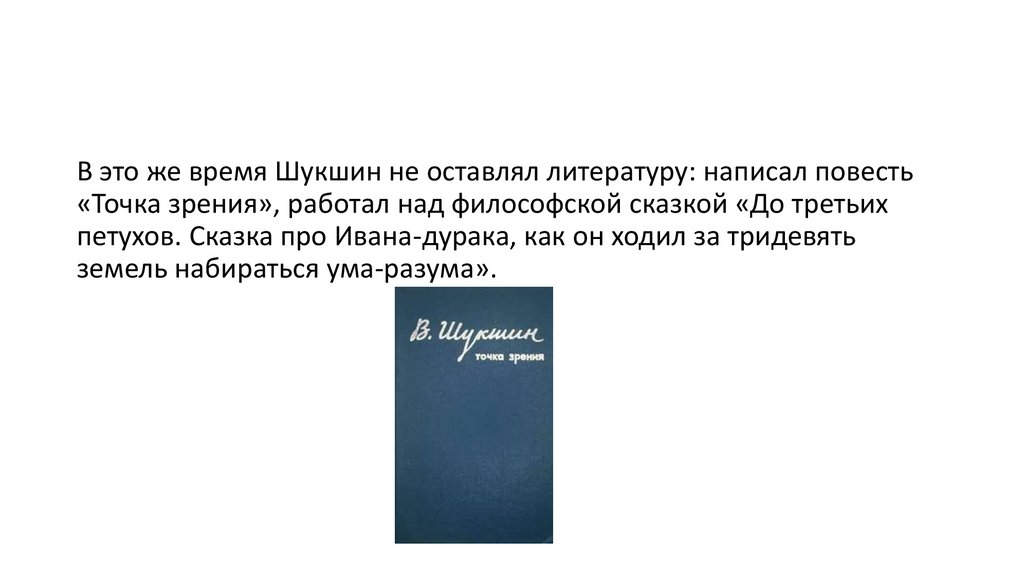 В это же время Шукшин не оставлял литературу: написал повесть«Точка зрения», работал над философской сказкой «До третьих