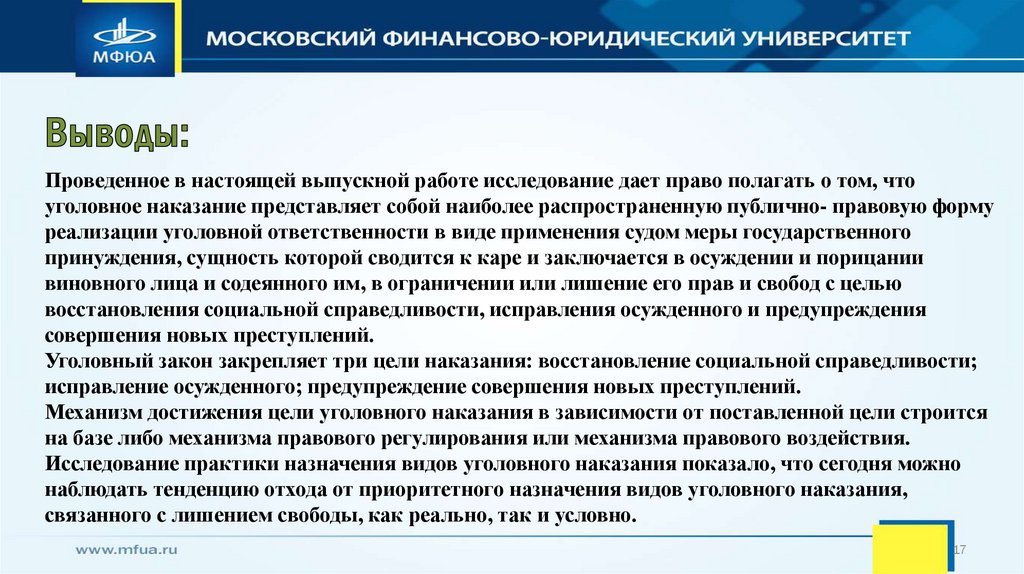 Проведенное в настоящей выпускной работе исследование дает право полагать о том, чтоуголовное наказание представляет собой наиболее распространенную публично- правовую форму
