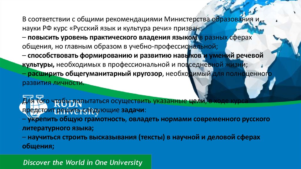 В соответствии с общими рекомендациями Министерства образования инауки РФ курс «Русский язык и культура речи» призван:
