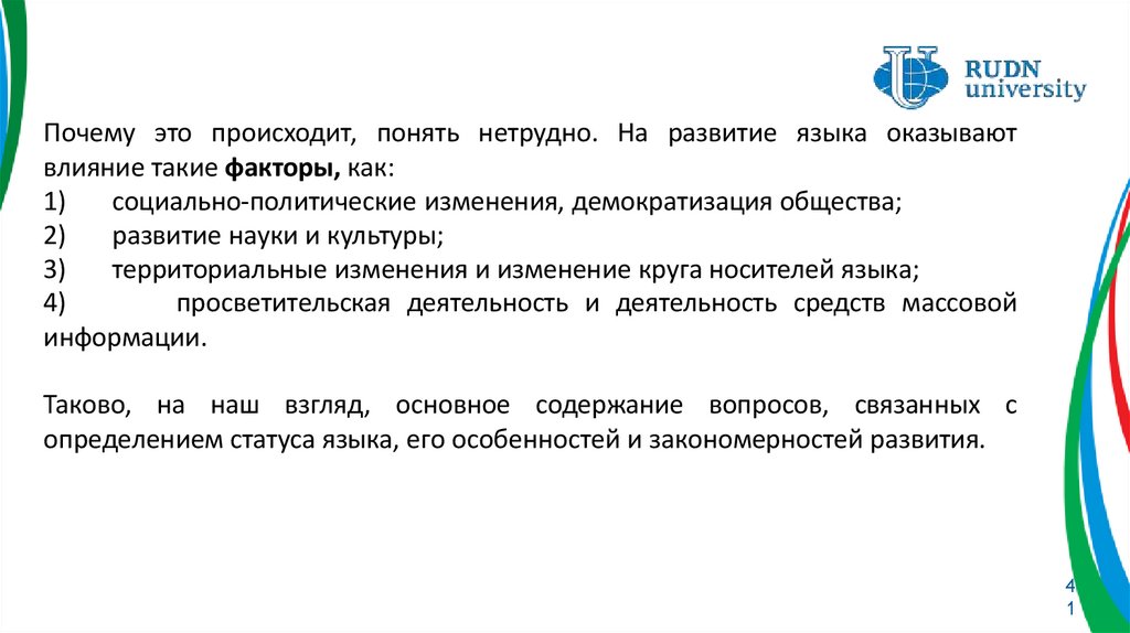 Почему это происходит, понять нетрудно. На развитие языка оказываютвлияние такие факторы, как:
