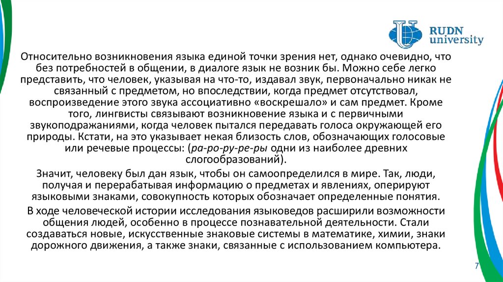 Относительно возникновения языка единой точки зрения нет, однако очевидно, чтобез потребностей в общении, в диалоге язык не возник бы. Можно себе легко