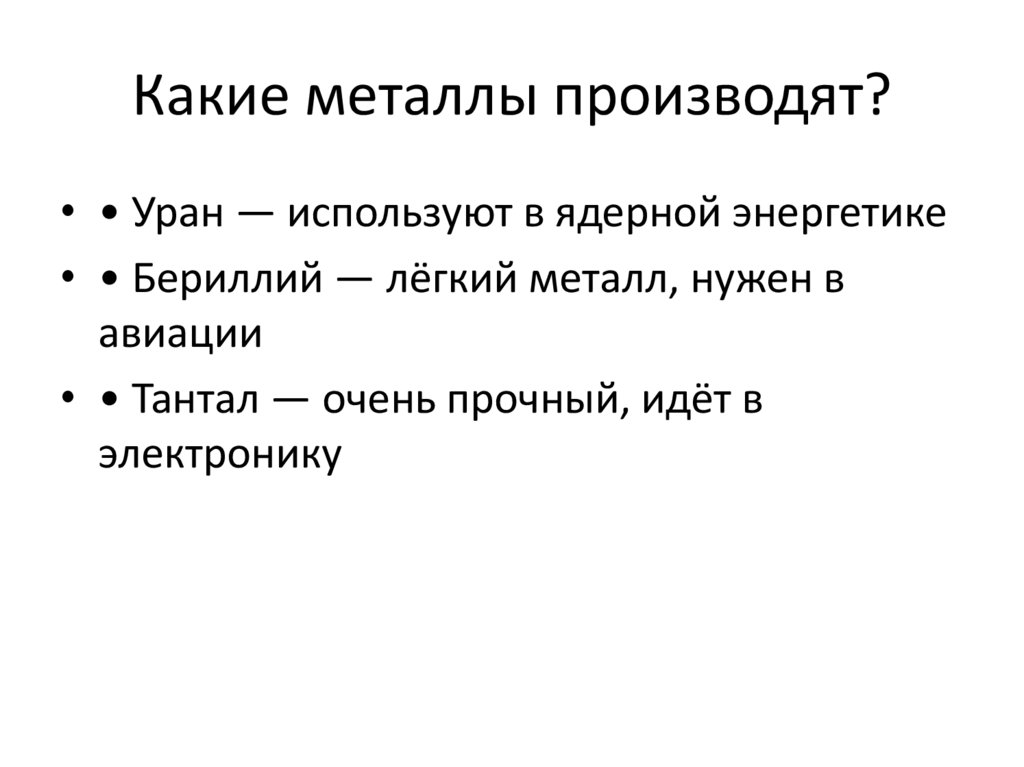 Какие металлы производят?• • Уран — используют в ядерной энергетике