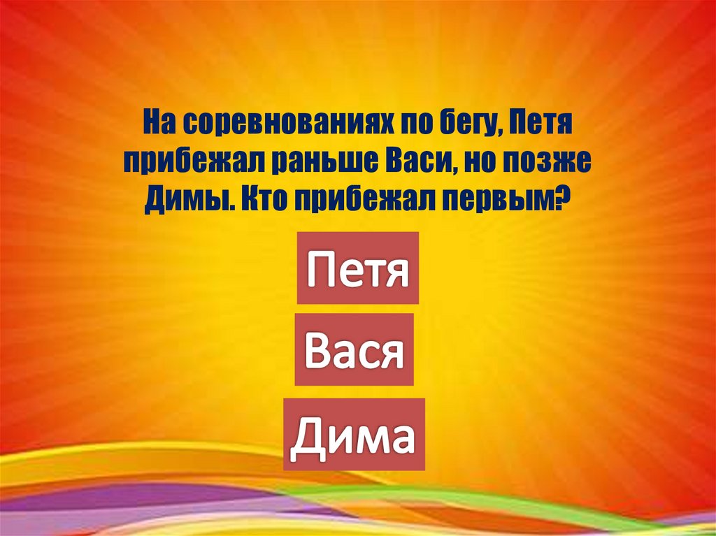 На соревнованиях по бегу, Петяприбежал раньше Васи, но позже