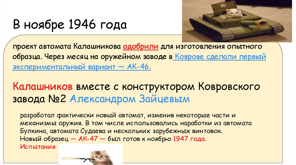В ноябре 1946 годапроект автомата Калашникова одобрили для изготовления опытного