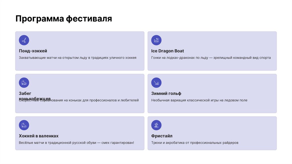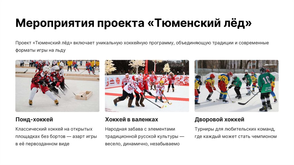 Мероприятия проекта «Тюменский лёд»Проект «Тюменский лёд» включает уникальную хоккейную программу, объединяющую традиции и современные