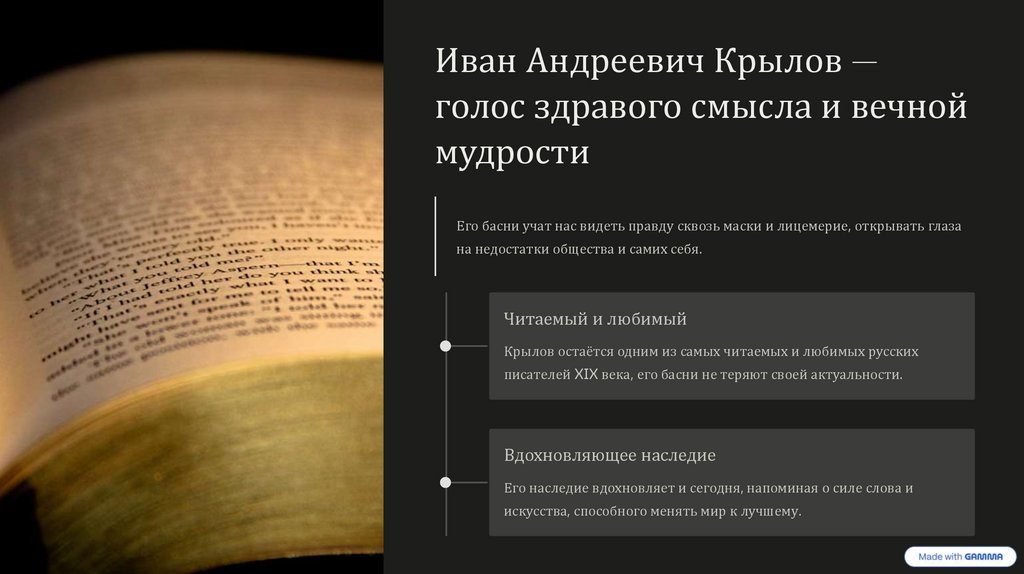 Его басни учат нас видеть правду сквозь маски и лицемерие, открывать глаза